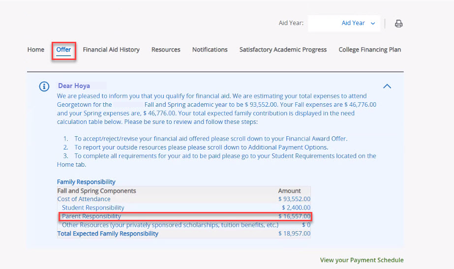 • You can find your current year Fall/Spring Parent Responsibility in GU Experience, in the Financial Aid Section, under the “Offer” tab. Below the “Family Responsibility” section.